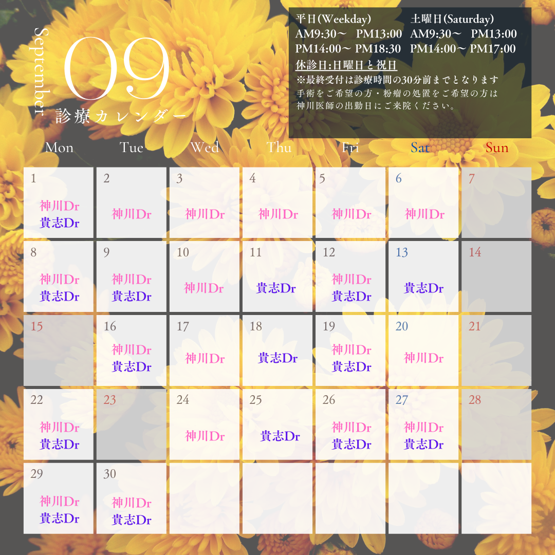 9月11日(木)、13日(土)、18日(木)、25日(木)