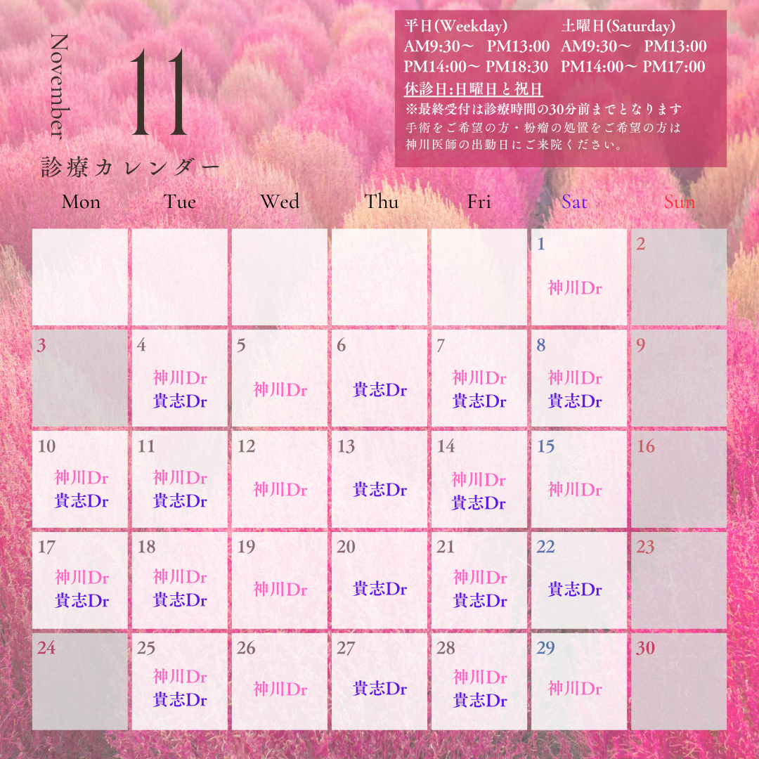 11月1日(土)、5日(水)、12日(水)、15日(土)、19日(水)、26日(水)、29日(土)